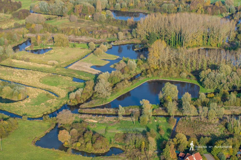 Le marais audomarois est splendide lorsqu’il se visite au fil de l’eau. Il est encore plus surprenant vu du ciel ! Si vous n’avez pas eu un jour l’occasion de le survoler en avion ou en montgolfière, les nombreuses photos aériennes disponibles sur Internet vous donne un aperçu. Vu de haut, le marais audomarois fait figure de gigantesque mosaïque nous dévoilant ses 700 kilomètres de watergangs, ses milliers de parcelles ainsi que sa cinquantaine d’étangs. Certains ont été spécifiquement creusés pour la chasse et la pêche autrefois. D’autres sont les vestiges de l’exploitation de la tourbe du Moyen Âge au XIXème siècle. Il s’agissait, avant l’exploitation des houillères, du seul moyen de se chauffer ! L’une de ces tourbières attire particulièrement le regard eu égard à la surface qu’elle occupe. Il s’agit de la zone des étangs du Romelaëre qui occupe plus d’une centaine d’hectares !